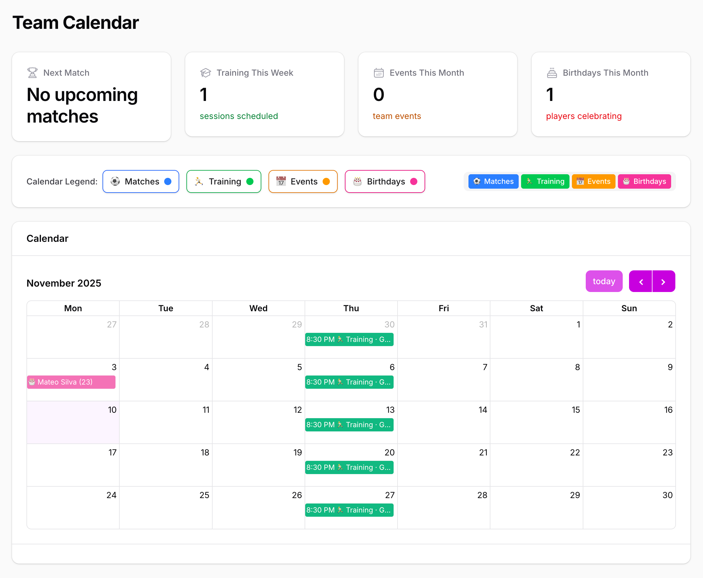 👉 Absolutely! Players can be assigned to multiple teams – perfect for players who train with both the U-18 and First Team, for example.
