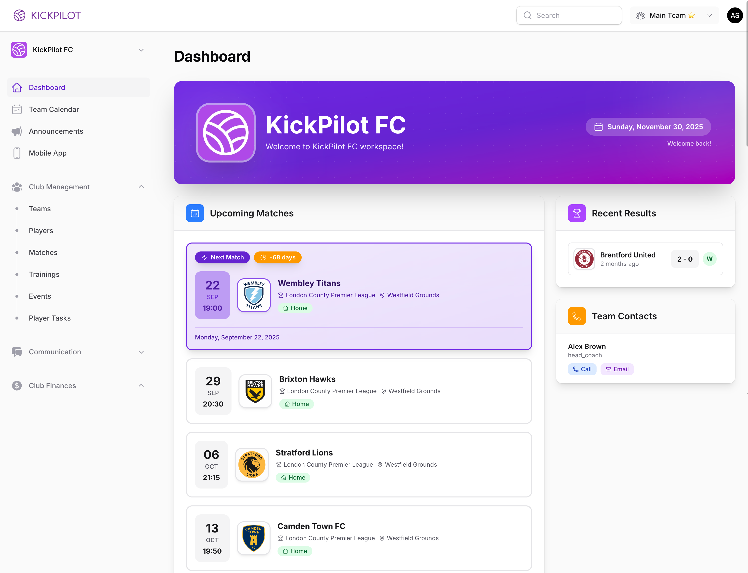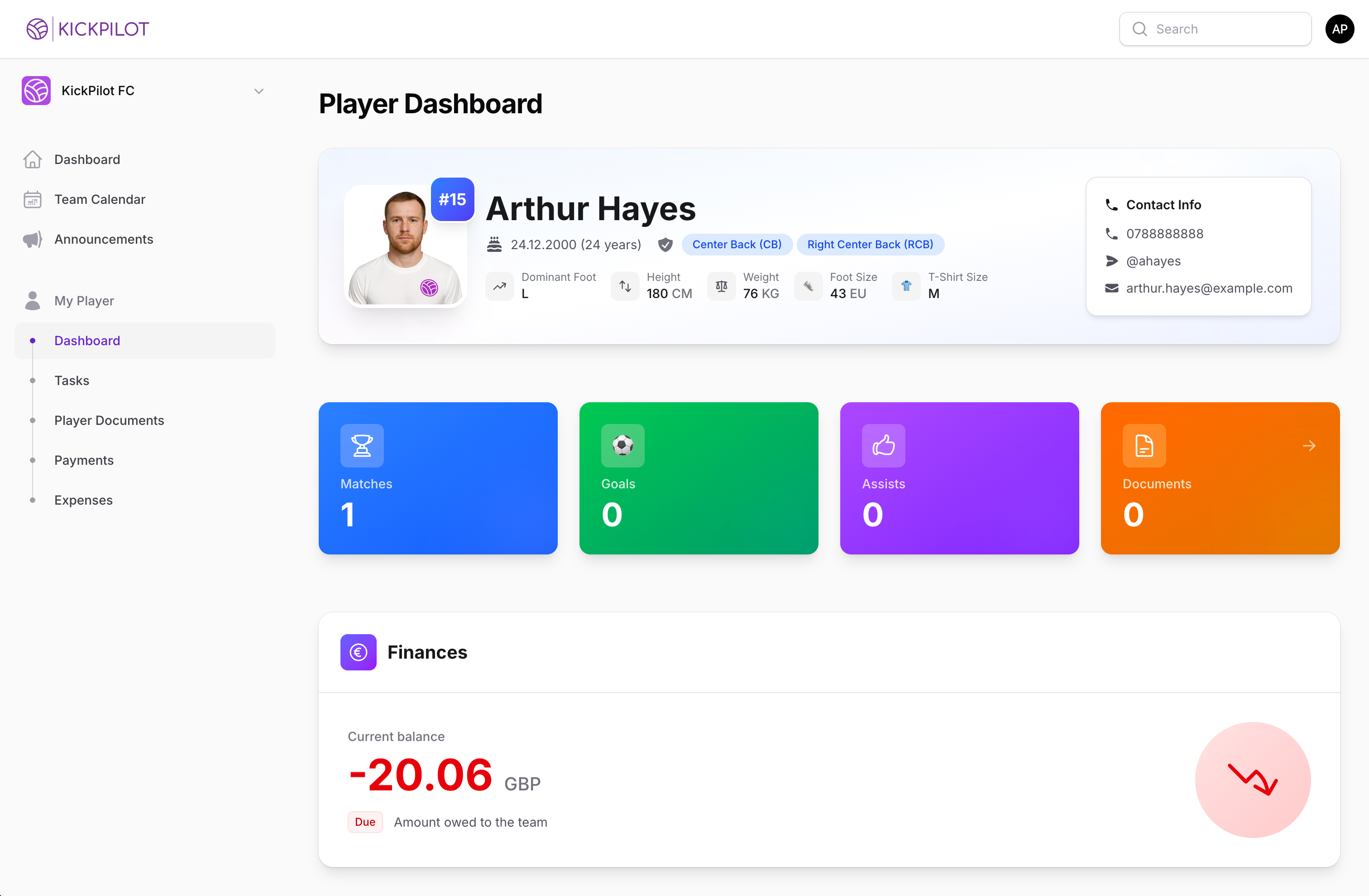 No more jumping between chats, docs, and endless tabs. KickPilot puts everything you need in one place – from player info and match history to payments and training plans.