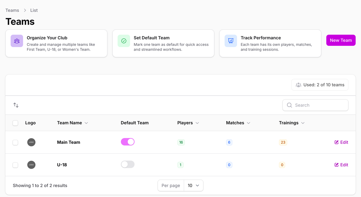 Switch between teams instantly, filter data by team, and assign players to multiple teams. Available on Pro (up to 3 teams) and Premium (up to 10 teams) plans.